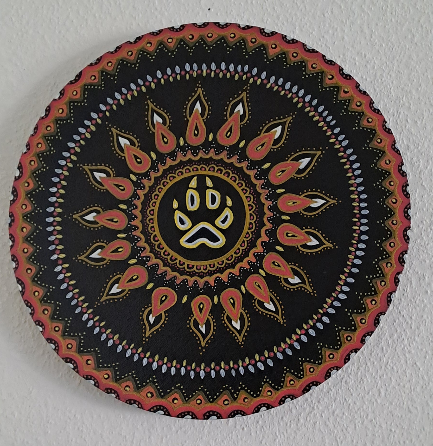 Ce tableau est une célébration de l’instinct, du feu intérieur et du lien sacré avec la nature sauvage. L’empreinte du loup, peinte en jaune et orange, incarne la chaleur, la vitalité et la puissance du territoire ancestral.